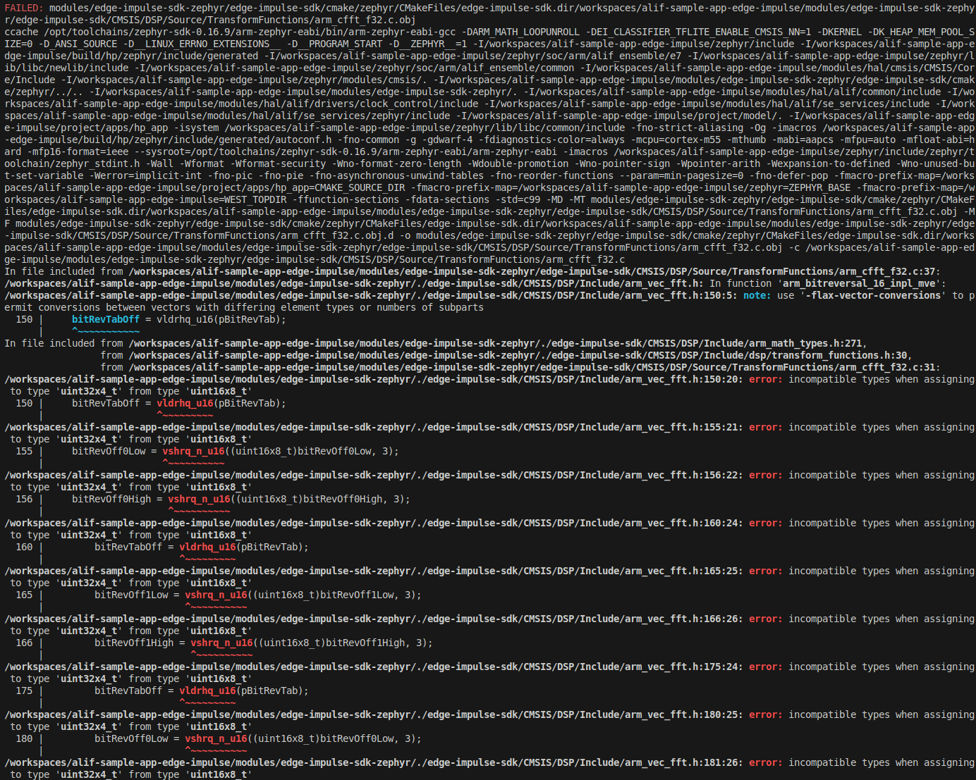 I’m working on a project using Edge Impulse + Zephyr on the Alif E7 Development Kit, and I’m encountering a blocking compilation issue inside the Edge Impulse library Zephyr library.