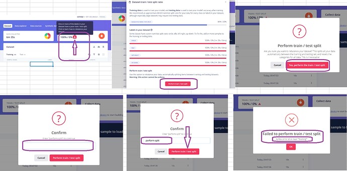 I have a student who is experiencing an error when clicking the “Perform train / test split” button. They receive an error message that says “Failed to perform train / test split” and “Input does not match ‘perform split’, aborting.”