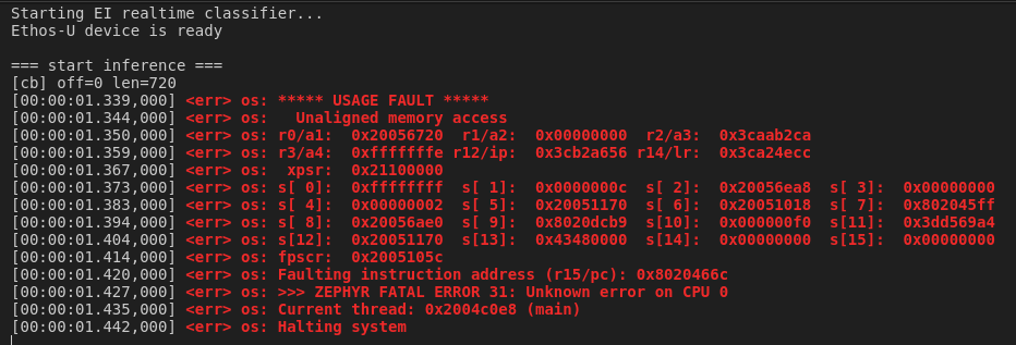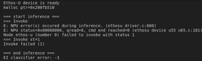 I am working on an Alif Ensemble E7 (Cortex-M55 + Ethos-U55) running Zephyr RTOS, and I am trying to deploy an Edge Impulse model that should run on the Ethos-U55 NPU.