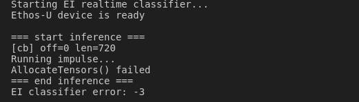 But after that, the program never continues: I never see the “after run_classifier” log (=== end inference ===). It doesn’t reboot and doesn’t appear to crash, but no more printf/ei_printf output appears after the call to run_classifier().