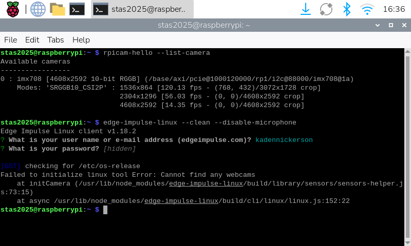 I then switched to a Raspberry Pi 5 with a fresh install of Raspberry Pi OS Bookworm (64-bit), but encountered an issue—the camera works fine with rpicam-hello, yet Edge Impulse cannot detect it.